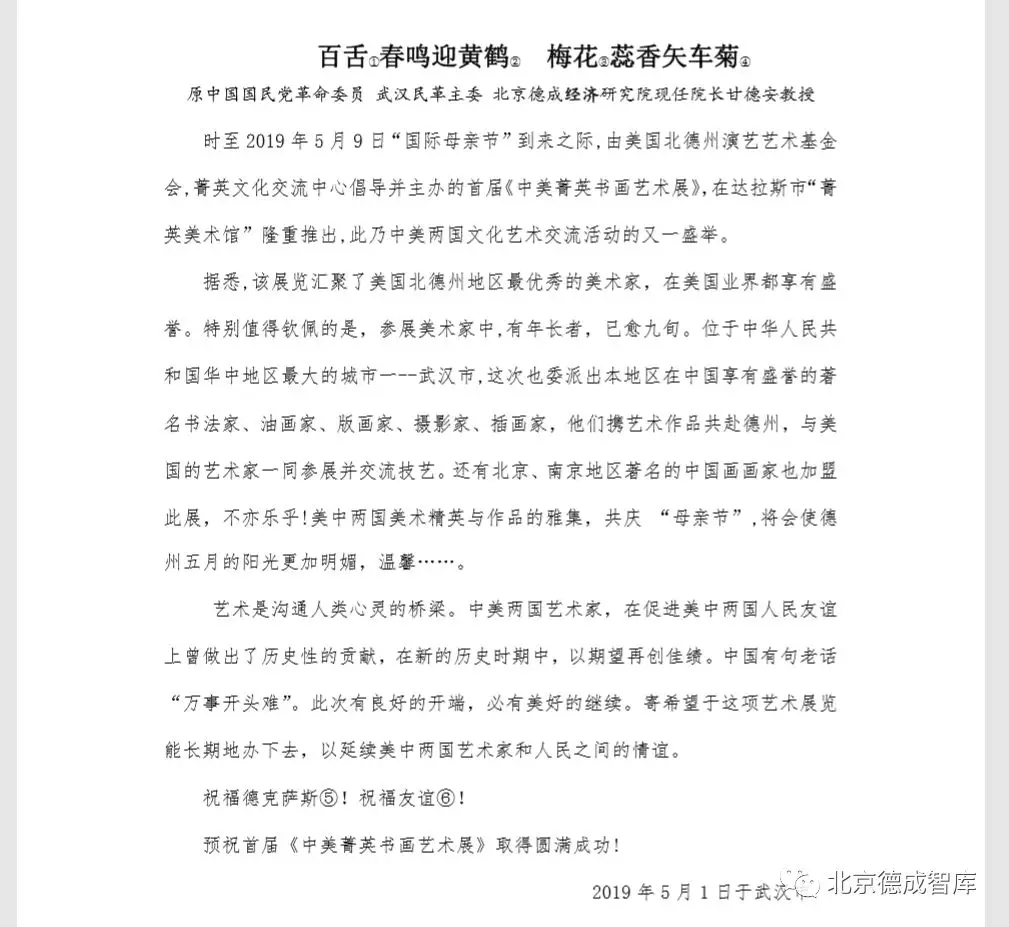 我院藝術(shù)總監(jiān)周勇先生、媒體部總監(jiān)曹軼秋女士赴美參加達(dá)拉斯市首屆《中美菁英書畫藝術(shù)展》獲得圓滿成功 原創(chuàng): 北京德成智庫