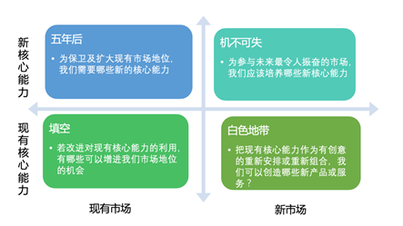 擬定新的發(fā)展戰(zhàn)略我們可以借助核心能力與市場這兩個要素建立一個四維矩陣表。核心能力分為現(xiàn)有核心能力與新的核心能力,市場分為現(xiàn)有市場與新的市場。那么,我們就形成一個四維矩陣。左上角是新核心能力與現(xiàn)有市場的維度,就是五年后,為保衛(wèi)及擴大現(xiàn)有市場地位,我們需要哪些新的核心能力;右上角是新核心能力與新市場的維度,是機不可失,就是為參與未來最令人振奮的市場,我們應該培養(yǎng)哪些新核心能力;左下角是現(xiàn)有核心能力與現(xiàn)有市場,是填補空白,就是若改進對現(xiàn)有核心能力的利用,有哪些可以增進我們市場地位的機會;右下角是現(xiàn)有核心能力與新市場,是白色地帶,就是把現(xiàn)有核心能力作為有創(chuàng)意的重新安排或重新組合,我們可以創(chuàng)造哪些新產(chǎn)品或服務?見下圖表1。