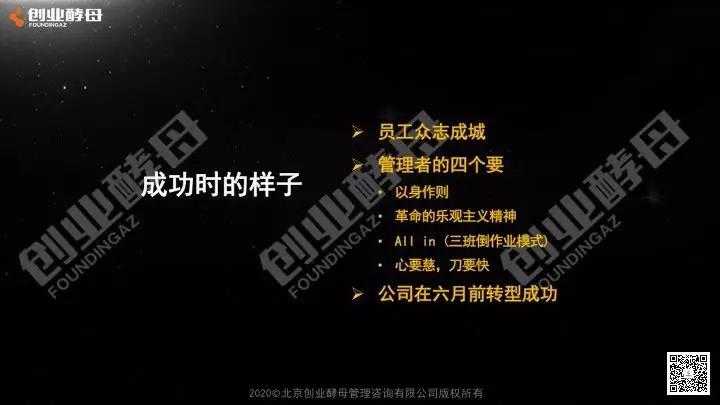那什么時(shí)候才算轉(zhuǎn)型成功呢?我給自己定了一個(gè)目標(biāo):第一,在線營(yíng)收要和線下達(dá)到一樣的規(guī)模;第二,產(chǎn)品服務(wù)要在線上全部跑通;第三,客戶的滿意度要非常高。在這個(gè)過程中,企業(yè)還是要定一個(gè)目標(biāo)的。